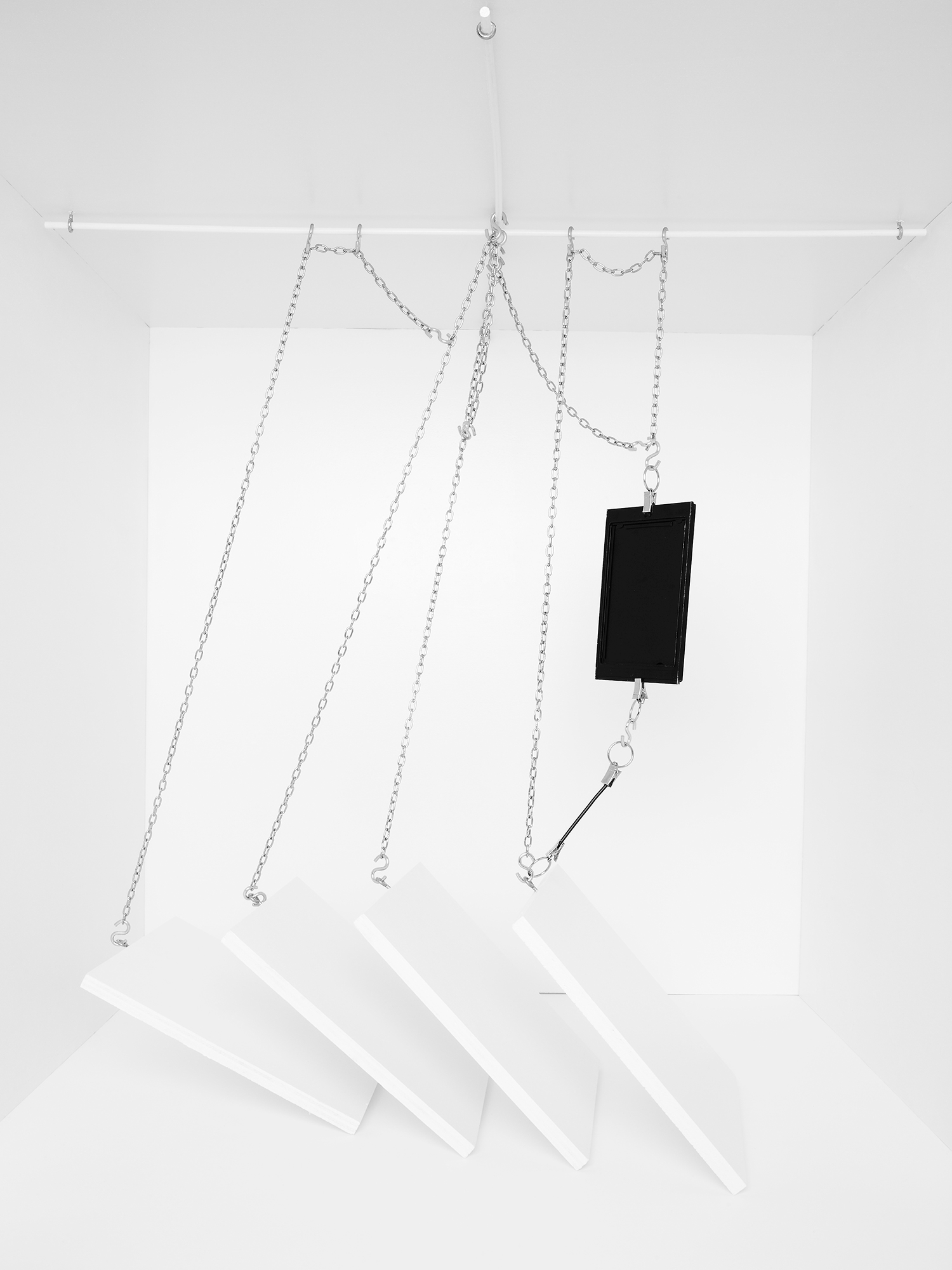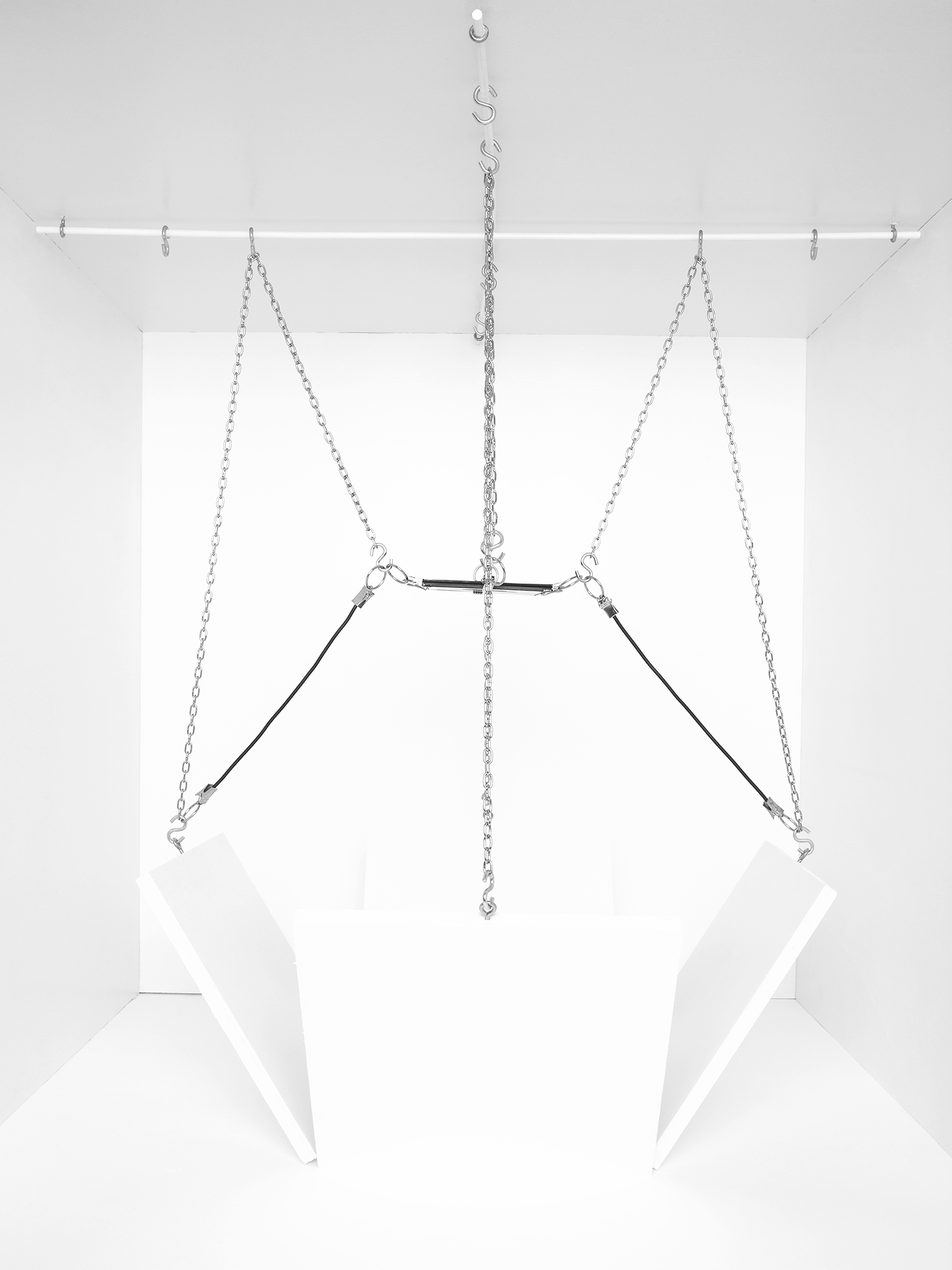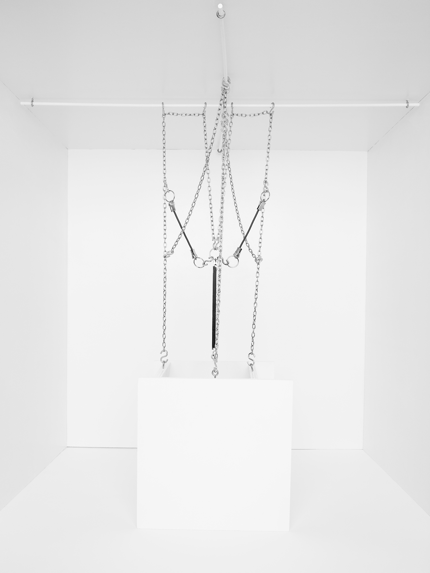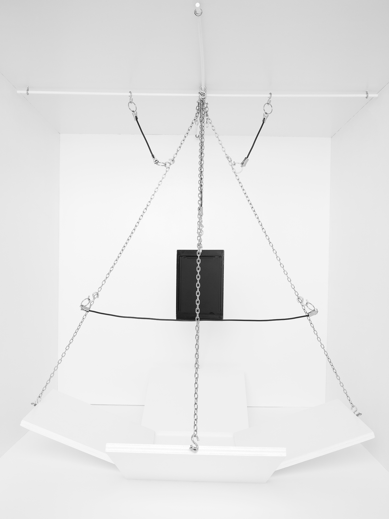 The series ‘Cable Rooms’ represents the human mind as an abstract machine with an invisible operator. The white and minimalist environment references the scientific laboratory, as well as the modernist ‘white cube’ gallery aesthetic. These spaces both isolate complex experiences and phenomena from the everyday environment, to examine these in a closely controlled environment.